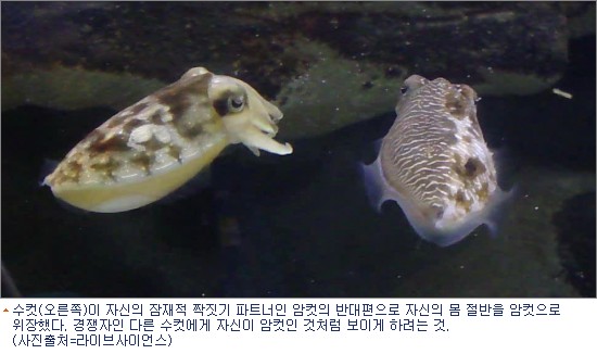 암컷을 쟁취하기 위한 갑오징어의 놀랍고, 기발한 위장술이 연구를 통해 밝혀졌다.