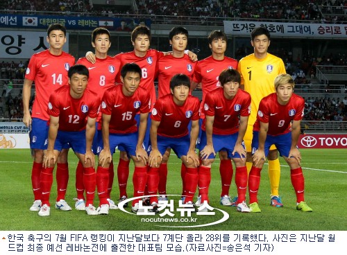 국제축구연맹(FIFA)의 7월 세계 랭킹에서 한국은 랭킹 포인트 740점으로 지난달보다 21점이 늘어 순위가 35위에서 28위로 뛰어올랐다. 아시아에서는 일본이 20위로 가장 높았고, 호주가 23위로 뒤를 이었다. 북한은 89위, 제자리였다.