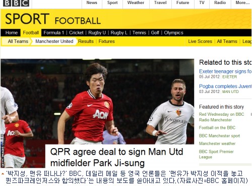 영국 BBC는 7일(이하 한국 시각) 인터넷판 스포츠면 톱으로 ''QPR이 맨유와 박지성 이적에 합의했다''는 제목의 기사에서 "QPR이 이적료 500만 파운드(약 88억 원)를 제시해 계약이 임박했다"고 전했다.