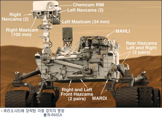 [BestNocut_R]착륙 3일 후에 좁은 시야각의 마스트캠(마스터 카메라)이 촬영을 시작한다. 이 두 개의 백만 화소 컬러 카메라는 큐리오시티 주변 지형을 정밀하게 파악할 수 있게 해준다. 한주 정도가 지나면 이 고해상도의 사진을 수신할 수 있다.