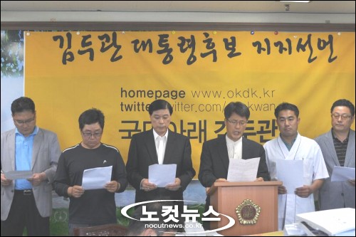지지자 대표 백자욱 교수(창원대 금융보험학과) 등 지지자들은 7일 오후 경남도의회에서 기자회견을 갖고 "박근혜 후보를 이길 수 있는 유일한 후보인 김두관 후보를 지지한다"고 밝혔다.