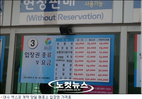 여수 엑스포 개막 당일 매표소 입장권 가격표