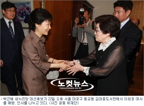 박근혜 새누리당 후보는 22일 고(故) 김대중 전 대통령 부인 이희호 여사를 만나 김 전 대통령과의 인연에 대해 이야기를 나누며 ''국민대통합''의 의지를 재차 확인했다.