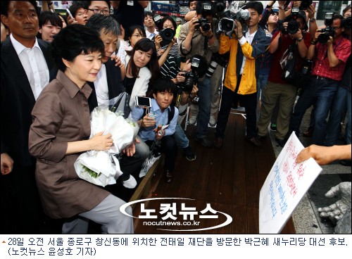 박 후보는 28일 국민대통합 행보의 일환으로 전태일 재단을 찾았지만 유족들과 쌍용차 노조원들의 거부로 방문이 무산됐다. 이어 박 후보는 청계천 6가의 ''전태일 다리''에 도착해 전태일 동상에 헌화하려 했지만 역시 쌍용차 노조원들의 반대로 돌아서야 했다.