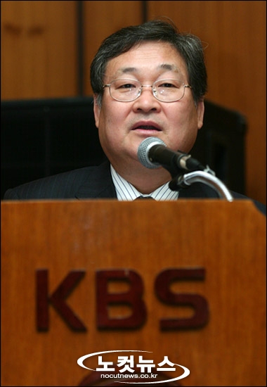 10일 오후 여의도 KBS 신관 국제회의장에서 열린 드라마 ''황금사과''(연출 신창석, 극본 김운경)의 시사회 및 기자간담회에서 정연주 KBS 사장이 단상에 올라 축사를 통해 드라마의 성공을 기원하고 있다.