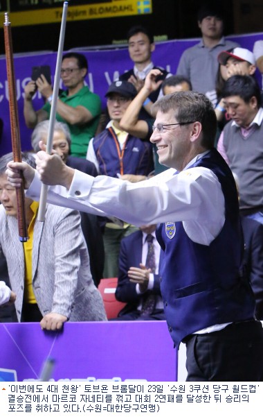 6회째를 맞는 이 대회는 모두 이른바 3쿠션 ''사대천왕''이 정상에 올랐다. 1회 대회는 국내에서 인기가 높은 다니엘 산체스(6위, 스페인), 2 · 4회는 딕 야스퍼스(9위, 네덜란드), 3회는 쿠드롱이 제패한 데 이어 브롬달이 지난해와 올해 왕좌에 올랐다.