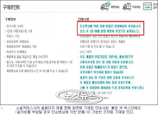 실제 W사의 제품 설명 화면에는 안내사항으로 ''''단순변심에 의한 교환 반품은 설치비용이 부담됩니다. 설치 후 7일 이내 불량 확인 시 무상으로 교환됩니다.''''라고 기재돼 있어 설치비만 부담하면 단순 변심에 의한 반품도 가능한 것으로 돼 있었다.