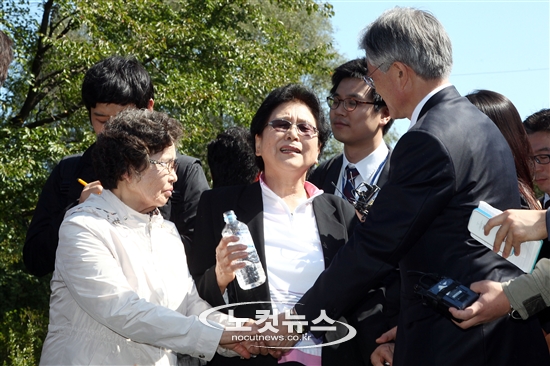 민주통합당 문재인 대선후보가 2일 오전 경기도 남양주시 마석 모란공원에서 인혁당 사건으로 사형당한 故 김용원 씨의 묘소를 참배하고 유가족들과 이야기를 나누고 있다