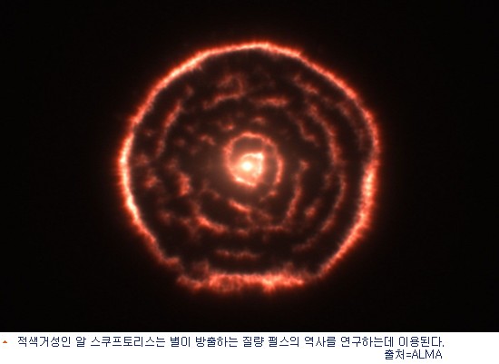 국제천문학자연구진이 세계 최대 규모이자 최고가인 북 칠레의 알마 전파망원경(ALMA :Atacama Large Millimeter/Submillimeter Array: 66개의 전파 접시안테나를 연결해 서로 협력해 관측할 수 있도록 한 전파망원경 네트워크를 가리킨다)을 이용해 이전에는 본 적이 없는 독특한 모양의 나선형 구조를 발견했다. 이 나선형 구조는 적색거성 주변의 먼지와 가스로 구성된 가스체이며 지구로부터 1,000 광년 떨어져 있다.