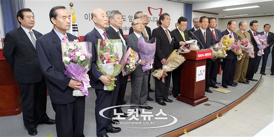유갑종, 김형광 전 의원 등 김대중(DJ) 전 대통령의 옛 동교동계와 김영삼(YS) 전 대통령의 상도동계 전직 의원 20여명이 15일 오전 여의도 새누리당 당사에서 박근혜 후보 지지 선언을 하고 있다.