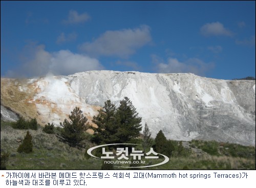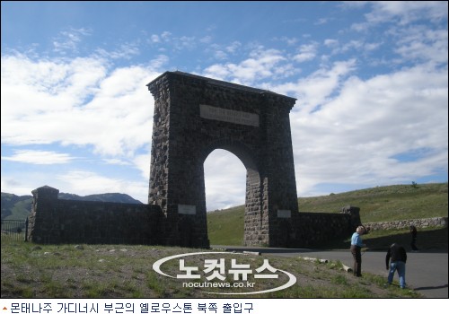 옐로우스톤이 북미 최대인 록키산맥에 자리잡고 있어 공원가는 길은 줄곧 오르막이었다. 가디너에서 자동차로 약 10킬로미터를 달리면 옐로우스톤 국립공원의 북쪽 출입구가 나온다. 메머드 핫 스프링스의 석회석 고대(高臺)와, 록키산맥의 원시림, 거대 협곡 사이로 흘러가는 옐로우스톤강, 경치가 하나 같이 중후장대해 원시자연의 힘과 역동성이 느껴졌다.