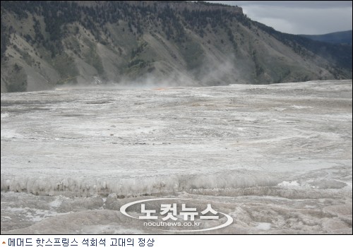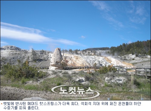 온천수가 유황, 마그네슘 같은 광물과 작용해 색상도 다채롭다. 에메랄드와 호박빛을 내는 온천이 가장 많지만 간혹 보라색과 갈색 온천도 눈에 띤다. 휴화산 지대는 메머드 핫 스프링스에서 올드페이스펄까지 약 80킬로미터 구간에 걸쳐 있다. 그 중 가장 북쪽에 위치한 화산온천이 바로 메머드 핫 스프링스이다.[BestNocut_R]