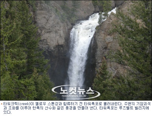 도로 바로 옆을 흐르는 옐로우스톤강 지류는 내려다보기가 아찔할 정도로 깊이 패인 협곡이다. 산과 산 사이를 흐르는 흔히 볼 수 있는 강과는 다르다. 빙하가 화산지형을 깊게 파낸 자리를 오랜 세월 강물이 깎아내 강줄기가 형성된 곳이다.
