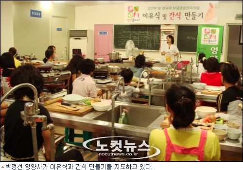 박정선 영양사가 이유식과 간식 만들기를 지도하고 있다