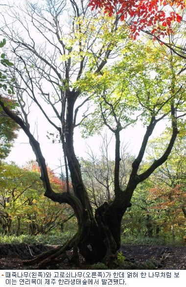 뿌리가 서로 다른 나무의 줄기가 이어져 한 나무로 자라는 연리목(連理木)이 제주에서 발견됐다.