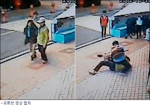 유튜브에 따르면 지난 28일 업로드된 ''묻지마 폭행''이라는 3분46초짜리 동영상에서 비틀거리는 한 취객이 한 젊은 커플의 여성 머리채를 잡고 실랑이를 벌이는 장면이 나온다.