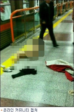 지하철 승강장에서 알몸으로 엎드려 있는 여성의 사진이 공개돼 충격을 주고 있다.