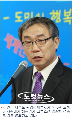 김선우 제주도 환경경제부지사는 15일 제주도청에서 기자회견을 열고 "해군기지에서 15만톤 크루즈선 2척이 동시에 입·출항 할 수 있는지에 대해 선박조종 시뮬레이션을 실시하기로 정부와 합의했다"고 밝혔다.