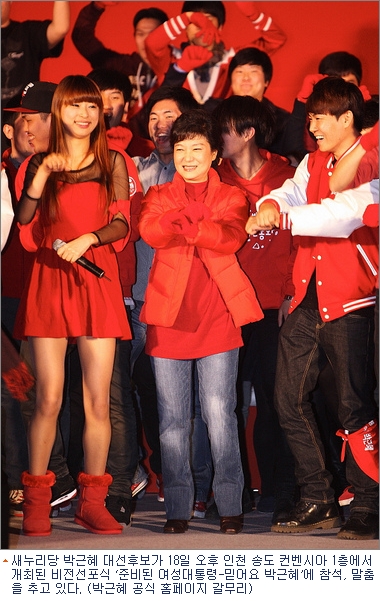 빨간색 니트와 점퍼, 청바지를 입고 연단에 선 박 후보 뒤편에도 20.30세대들이 둘러싸 ''박근혜''를 연호했다. 박 후보는 연설을 마친 뒤 가수 싸이의 ''강남스타일''을 개사한 ''근혜스타일''에 맞춰 말춤을 췄다.