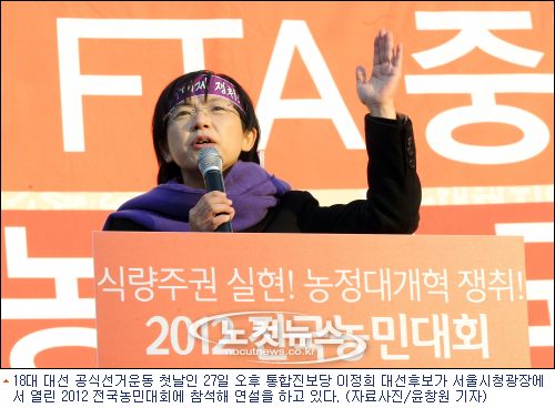 29일 부산을 방문한 통합진보당 이정희 대선후보는 "한국정치 혁신은 박근혜 후보가 청와대에 다시 못 들어가게 하는 데서 시작된다"고 밝혔다.