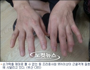 노동환경 연구소는 전남 학교 급식 조리원 1387명을 대상으로 조사를 벌였는데 이 중 1321명, 95.2%의 조리원이 미국 산업안전보건연구소 기준의 증상호소자에 해당됐다.