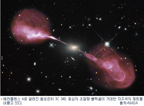 헤라클레스A의 제트분출은 은하 중심의 초질량 블랙홀의 중력에너지에 의해 발생한다.