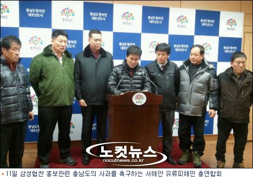 서해안 유류피해민 총연합회는 11일 충남도청에서 기자회견을 갖고 "태안 기름유출사고의 가해자이면서도 사회적 책임을 외면하는 삼성의 협찬을 받아 내포신도시 이전 방송홍보를 기획한 것은 유류피해 주민을 충남도민으로 보지 않는 행위"라며 공개 사과를 요구했다.