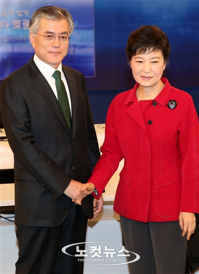 박근혜 새누리당 대선후보(오른쪽)와 문재인 민주통합당 대선후보가 16일 저녁 서울 여의도 KBS방송국에서 열린 제18대 대통령선거 후보자 3차 토론회에서 악수하고 있다.