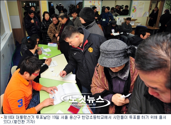 18대 대통령 선거가 근래 보기 드물게 뜨거운 열기 속에서 진행되고 있다. 19일 오후 3시 현재 잠정 집계된 투표율은 59.3%이다. 이는 최종 투표율 80.7%를 기록했던 지난 1997년 대선의 같은 시간대 투표율(61.9%)보다 불과 2.6%포인트 낮은 수준이다.