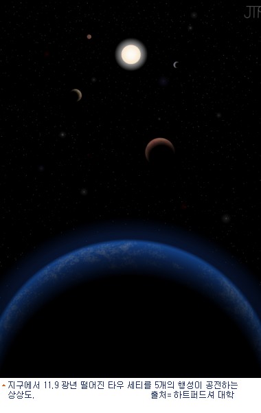 ▲가장 작은 태양계KOI-500별은 오밀조밀하게 공전하는 5개의 행성을 가졌다. 워낙 가까이 붙어있기 때문에 서로의 중력에 의해 불규칙하게 움직이기도 한다. 공전 주기는 1, 3, 4.6, 7.1, 9.5일에 불과하다. 지구 공전주기의 150배 이상 적다. 행성의 크기도 작아서 지구의 1.3~2.6배에 불과하다.