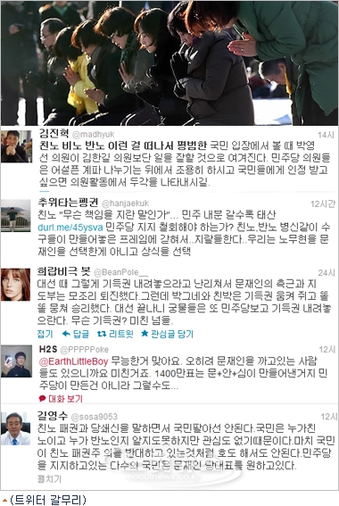 트위플 @madhyuk는 "친노 비노 반노 이런 걸 떠나서 평범한 국민 입장에서 볼 때 박영선 의원이 김한길 의원보단 일을 잘할 것으로 여겨진다. 민주당 의원들은 어설픈 계파 나누기는 뒤에서 조용히 하시고 국민들에게 인정 받고 싶으면 의원활동에서 두각을 나타내시길"이라는 글을 올렸고, @lhk0428는"민주당 초선의원들이 패배의 책임을 지고 3,000배 기도를 올리고 있다. 2030세대들과. 민주당 지지한 국민들의. 절망감이 깊다. 민주당은 깊이 사과하고 반성해서. 다시 정의의. 진보 깃발을 세워야한다"고 했다.