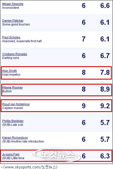 반면 중거리슛으로 1점을 내준 골키퍼 반 데사르와 볼을 많이 달고 다녔지만 특별한 소득이 없었던 호나우두, 후반 72분 교체돼 이렇다할 활약을 보여주지 못한 박지성 등은 최저 점수인 6점을 받았다.