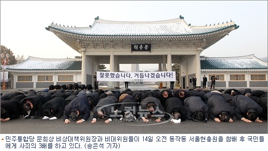 앞서 문 위원장을 비롯한 비대위원들과 의원 40여명은 이날 오전 서울 동작동 국립현충원을 참배하고 헌화를 마친 뒤 국민들에 대한 사죄와 참회의 삼배(三拜) 행사를 가졌다.