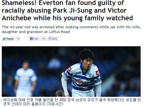 BBC방송과 선데이 미러 등 영국 매체들은 21일(현지 시각) 박지성과 나이지리아 출신 빅토르 아니체베(에버턴)에 대해 모욕적인 발언을 한 에버턴 팬 윌리엄 블라이싱(42)이 서부 런던 법원에서 열린 공판에서 유죄가 확정됐다고 전했다.