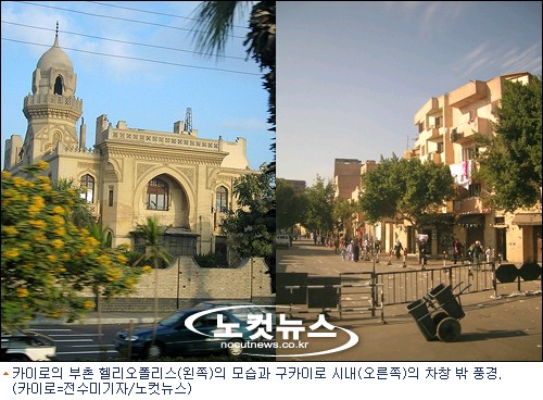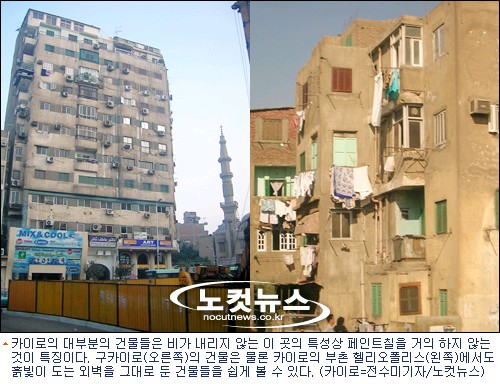 흙빛 건물 위에 그대로 드러난 철근 카이로 국제공항에서 구 카이로로 향하는 길은 내가 예상한대로 ''사람냄새가 가장 많이 나는'' 지역 가운데 한 곳 이다. 도로 양편에는 전 세계 관광객들을 이 곳으로 불러모으는 이슬람 사원과 형형색색의 무덤들 그리고 그 곳에서 일상을 꾸려나가는 서민들의 집이 공존하고 있다.