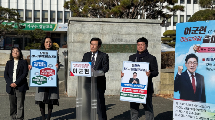 이군현 전 국회의원, 경남교육감 선거 출마 선언 이군현 전 국회의원은 지난 4일 경남교육청 정문에서 기자회견을 열고 "지금 경남 교육은 방향을 잃었다. 교육을 직접 해 본 사람, 정책을 만들고 실행해 본 사람이 나서야 할 때"라며 내년 경상남도교육감 선거 출마를 공식 선언했다. 2025.12.05 11:03