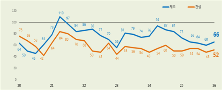 지역 기업 경기전망 하락세 완화…내년 1분기 전망지수 소폭 상승 내년 1분기 지역 기업들의 경기전망 지수가 소폭 상승하며 그 동안 보여왔던 하락세가 완화하는 모습을 보였다. 대구상공회의소가 지역기업 210개사를 대상으로 기업경기전망지수(Business Survey Index, BSI)를 조사한 결과,내년 1분기 제조업 BSI는 지난 4분기보다 6p 상승한 66, 건설업은 4p 상승한 52로 나타났다. 2025.12.29 08:51