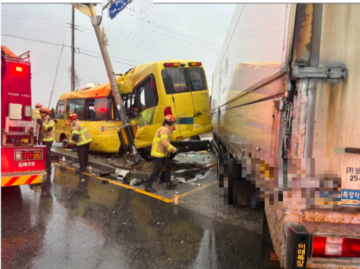 초등학교 통학 차량과 화물차 충돌…4명 중상 초등학교 통학 차량과 화물차가 충돌해 교사와 학생 등 4명이 크게 다쳐 병원으로 옮겨졌다. 23일 전북소방본부와 전북교육청 등에 따르면 이날 오후 4시 30분쯤 전북 김제시 공덕면의 한 교차로 인근에서 화물차와 인근 초등학교 통학 차량이 충돌했다. 2025.12.23 18:04