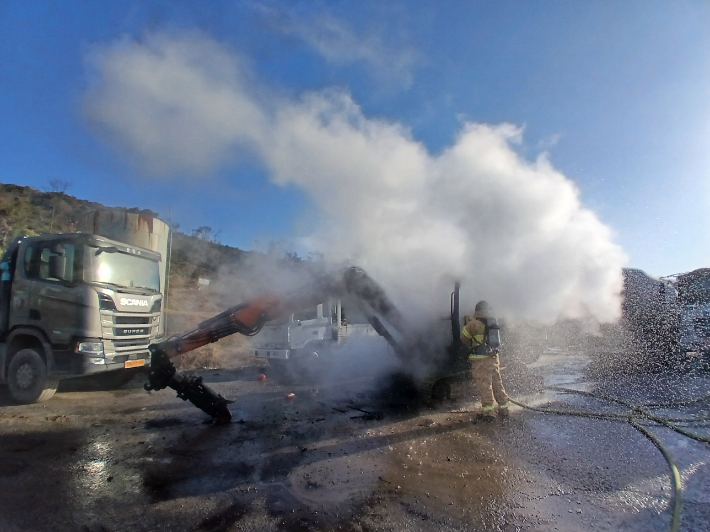 정읍서 굴착기 용접 작업 중 화재…인명피해 없어 지난 25일 오전 9시 5분쯤 전북 정읍시 고부면의 한 레미콘 사업장에서 작업 중인 굴착기에서 불이 났다. 이 불로 다친 사람은 없었지만, 굴착기 1대가 모두 타 약 4500만 원의 재산 피해가 발생했다. 2025.12.26 13:35