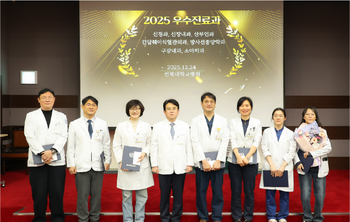 전북대병원, 연구성과 빛낸 '2025 우수 진료과․학술상' 선정 전북대학교병원은 탁월한 연구 활동을 통해 병원의 위상을 높인 진료 부서와 의료진을 대상으로 '우수진료과'와 '학술상'을 선정해 포상했다고 26일 밝혔다. 진료실적과 각종 지표에서 우수한 성과를 낸 우수진료과 수상은 △내과계(신경과·신장내과) △외과계(산부인과·간담췌이식혈관외과) △지원계(방사선종양학과) △치과계(구강내과·소아치과) 등이다. 2025.12.26 15:40