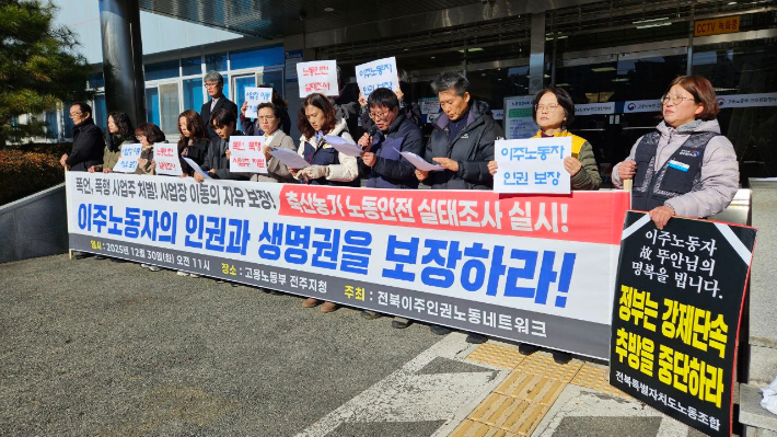 정읍서 이주노동자 폭행 의혹…단체 "고용노동부 방관 말아야" 전북 정읍의 한 돼지농장에서 관리자와 농장주가 이주노동자들을 폭행하고 욕설을 했다는 의혹이 제기된 가운데, 민주노총 전북본부 등 시민 단체가 고용노동부에 대책 마련을 촉구했다. 2025.12.31 15:53