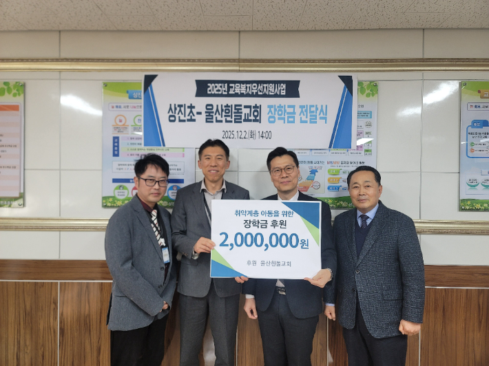 울산흰돌교회, 상진초등학교에 장학금 200만원 전달 울산 동구 방어동에 위치한 울산흰돌교회는 2일 상진초등학교에 장학금 200만 원을 전달했다. 이번 장학금은 취약계층 학생들의 안정적인 학업을 돕고자 마련됐다. 상진초는 학생 10명에게 20만 원씩 지원할 예정이다. 2025.12.02 16:45