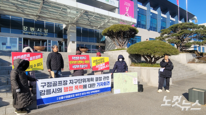 "주민들과 약속 저버린 강릉 구정골프장 재추진 전면 재검토하라" 강원 강릉시 구정면 일대에 추진되고 있는 골프장 조성사업과 관련해 일부 주민들이 반발하는 등 논란이 일고 있다. 강릉CC 건설 재추진 반대 주민대책위원회는 13일 강릉시청 앞에서 기자회견을 열고 "주민들과의 약속을 위반하고 재추진하는 골프장은 결사 반대임을 분명히 밝힌다"고 반발했다. 2026.01.13 17:14
