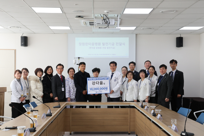 창원한마음병원, 암병원 건립기금 전달 이어져…강다율 씨 1천만 원 쾌척 창원한마음병원이 추진 중인 '첨단 암병원' 건립을 향한 지역민의 따뜻한 응원이 새해에도 이어지고 있다. 창원한마음병원은 지난 12일 본원 대회의실에서 강다율 씨가 암병원 건립 발전기금 1천만 원을 전달하며 새해 첫 전달식을 개최했다. 2026.01.13 19:11
