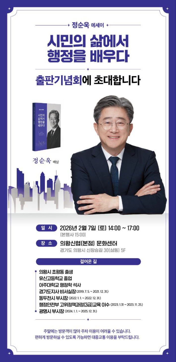 '이재명 비서실장' 정순욱, 의왕서 2월 7일 출판기념회 개최 이재명 대통령의 경기도지사 시절 비서실장을 지낸 정순욱 전 광명시 부시장이 자신의 에세이 '시민의 삶에서 행정을 배우다'를 펴냈다. 정순욱 전 부시장은 다음 달 7일 의왕신협 문화센터에서 출판기념회를 연다. 2026.01.13 19:34
