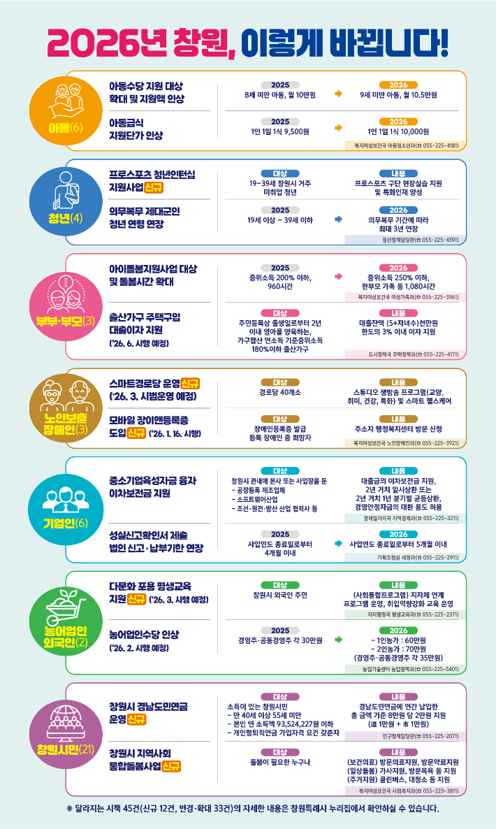 시민 정책체감도 높인다…창원시 '2026년 달라지는 시책' 발간 창원특례시가 2026년부터 새롭게 시행되거나 확대·변경되는 주요 시책을 한눈에 볼 수 있도록 정리한 '2026년 달라지는 시책' 책자와 전자책(e-book)을 발간했다. 2026.01.11 20:08