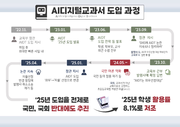 AI디지털교과서 미접속율 60%…감사원 "공론화·시범운영 등 없이 부실" 윤석열 정부가 도입한 'AI(인공지능) 디지털교과서'(AIDT) 자율선정 학교들의 활용 실태를 감사원이 점검한 결과 미접속률이 평균 60%에 달하는 것으로 확인됐다. 교육현장의 의견 수렴과 시범운영 과정을 거치지 않은 부실 운영 실태도 드러났다. 2025.12.17 14:29