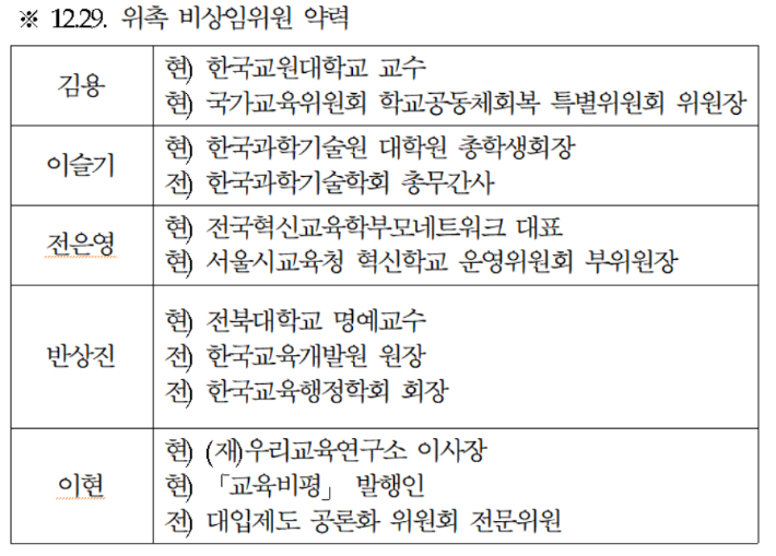 국교위, 이현 우리교육연구소 이사장 등 비상임위원 5명 위촉 국가교육위원회는 "이현·김용·이슬기·전은영·반상진 등 5명을 29일자로 비상임위원으로 위촉했다"고 31일 밝혔다. 입시업체 스카이에듀 설립자이자 우리교육연구소 이사장인 이현 비상임위원은 대통령 지명을 받았다. 나머지 4명은 국회가 추천했다. 2025.12.31 11:57