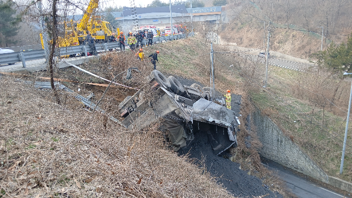 홍성군 도로서 25t 덤프트럭 전복…적재물 쏟아져 15일 오후 12시 50분쯤 충남 홍성군 홍성읍의 한 도로에서 25t 덤프트럭이 가드레일을 들이받고 전복됐다. 이 사고로 50대 운전자 A씨가 찰과상을 입고 병원으로 이송됐다. 또 적재함에 담겨 있던 석탄 자재가 쏟아졌다. 2026.01.15 18:34
