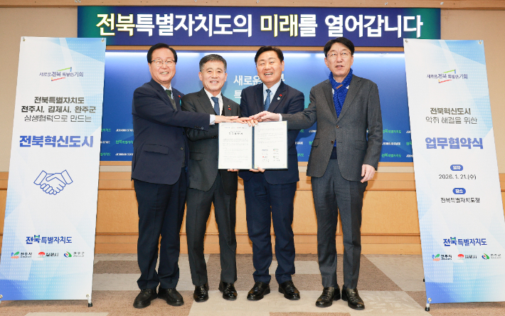 행정구역 벽 허문 '악취 해결'…전북·전주·김제·완주 맞손 전북 혁신도시의 고질적 민원인 악취 문제를 해결하기 위해 전북자치도와 인근 3개 시군이 행정구역을 초월한 재원 분담에 합의했다. 원인 제공 지역과 피해 지역이 공동으로 예산을 투입해 문제 해결에 나서는 전국 최초의 상생 협력 모델로 주목된다. 2026.01.21 11:03